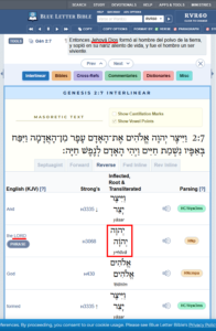 La frase Jehová Dios so simplemente Jehová es la traducción que habalamos antes del tetagramatón YHWH, que la en la Bilia King James se traduce como LORD, que quiere decir SEÑOR, como podemos apreciar usando la herramienta Blue Letter Bible, la cuál a su vez hace uso de la concordancia Strong, donde es marcada como palabra Strong H3068. Es Interesante que este texto dice que fué Yahweeh quien creó al hombre. Y por eso muchos que creen que Jehová y jesús son la misma persona divina ya que la Biblia también dice esto: