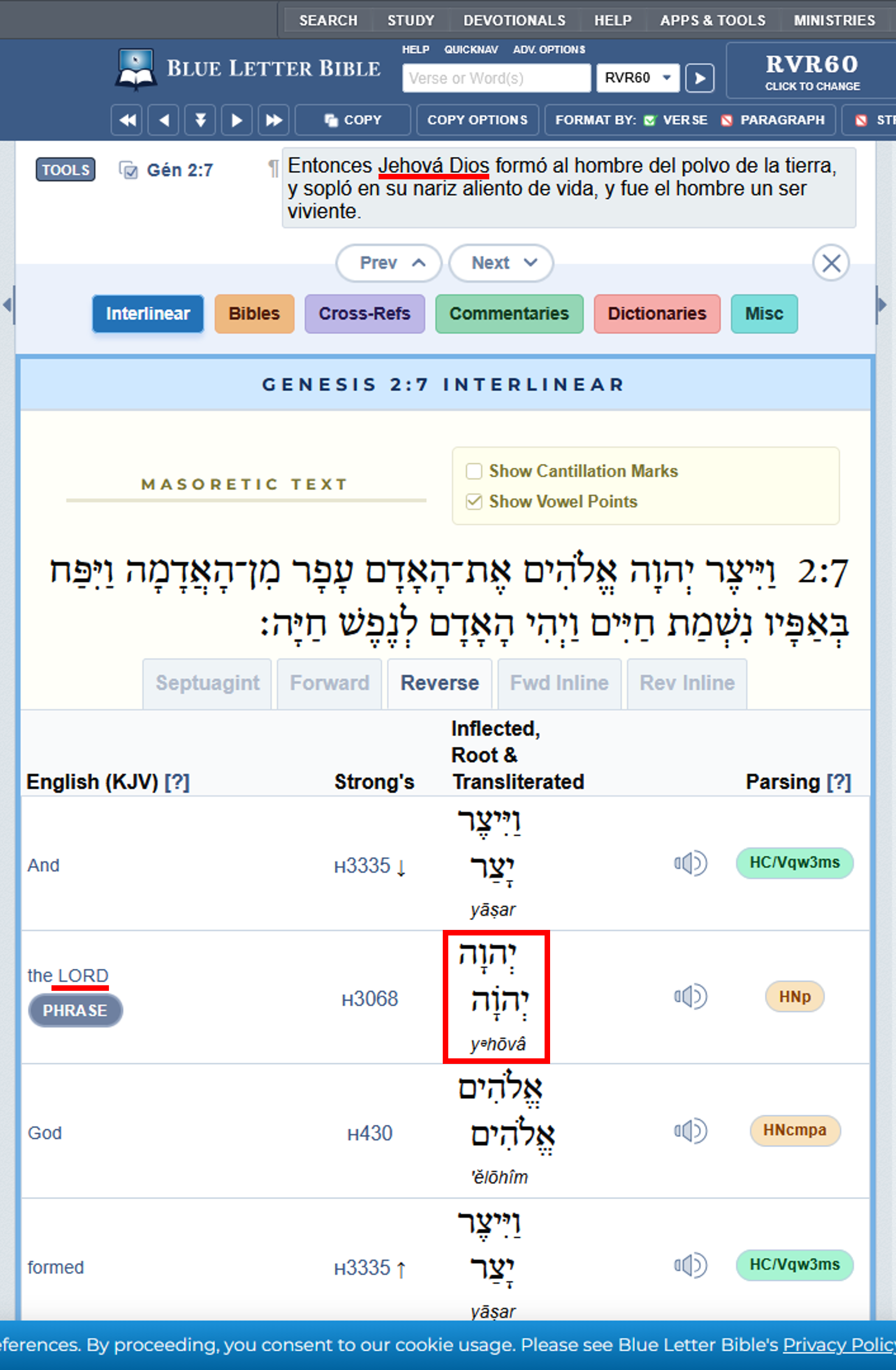 Y para que podamos verificar que lo que se dice en ambos videos es cierto, permitanme presentarles una herramienta que nos será extremadamente útil para evaluar algunos textos bíblicos: La Biblia Blue Letter. Mas que una Biblia, Blue Letter Bible (Biblia de Letra Azul) es una colección de Biblias y una herremienta de estudio que nos permite evaluar las escrituras en Hebreo y Griego, dos idiomas originales en que se escribieron sus pasajes. [5]Biblia Letra Azul